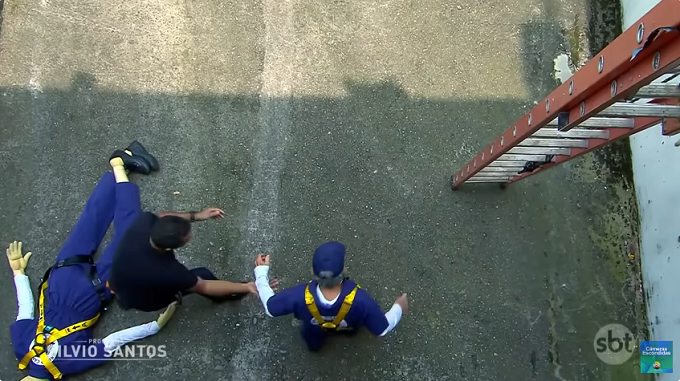 | Claro que tanto Ivo quanto Carlinhos tem uma forcinha do boneco que é jogado do alto do prédio... |
